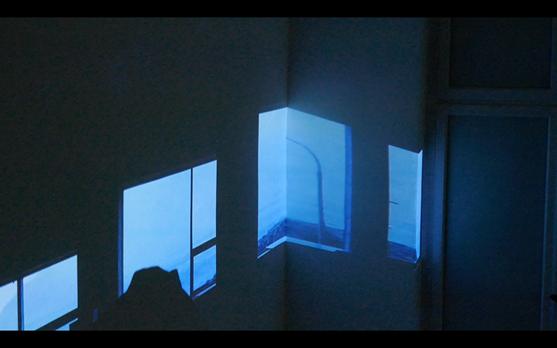 Videoinstallation, Pappe, Decken, 4 Filme.